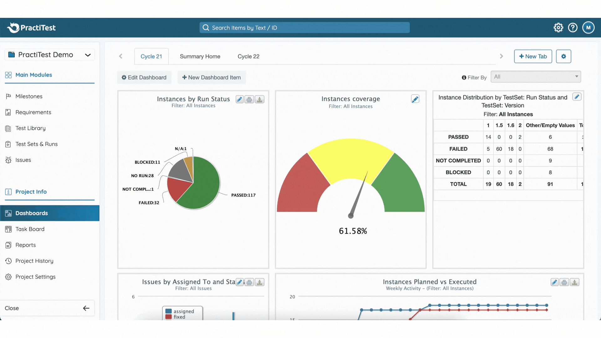 The PractiTest dashboard provides a detailed overview of your projects. View real-time data showing the portion of your planned tests that were executed, how many tests passed, how many open issues are waiting to be solved, and more. The dashboard enables you to manage not only your data, but your entire team. See how the workload is distributed, identify bottlenecks, and so on.